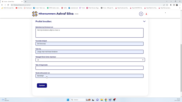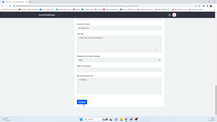4. Vul in alle gegevens zoals: “over mij, betrokken bij Hilversum om, favoriete trotspot, wordt enthousiast van, profielfoto.